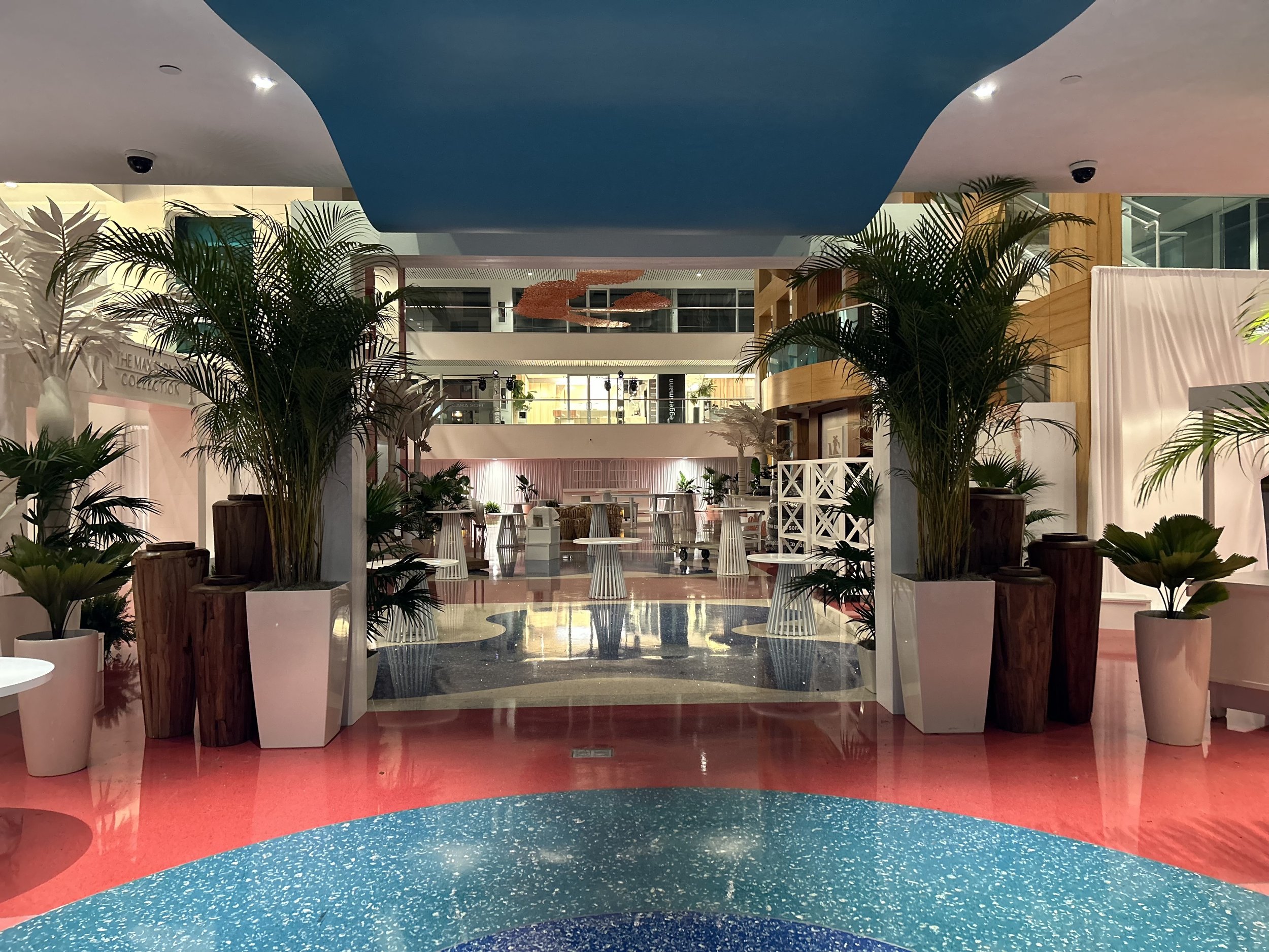 In addition to guiding guests through the venue, the rows of tropical palms also softened the architectural lines of the interior mall.